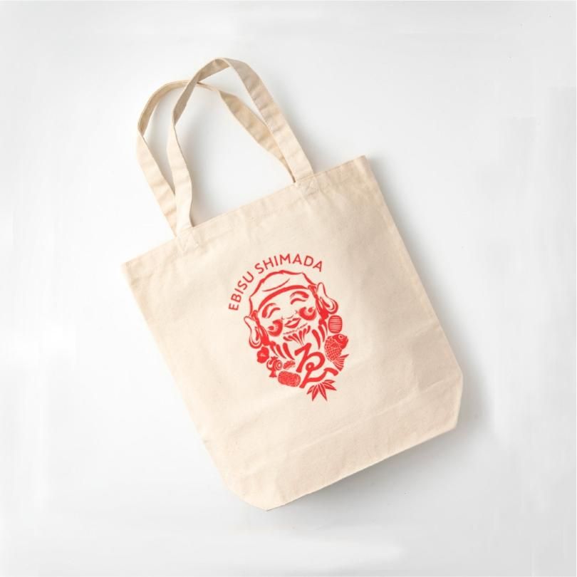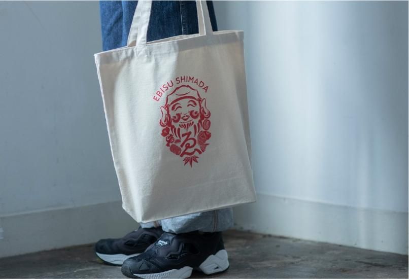 エビスシマダのシンボルマークをプリントしたしっかり肉厚な生地のキャンバストート。A4サイズのファイルもらくらく収納できる便利なサイズです。さらに約11cmのマチで収納力もバツグン。毎日使いたくなる使いごこちです。肩かけもOK。